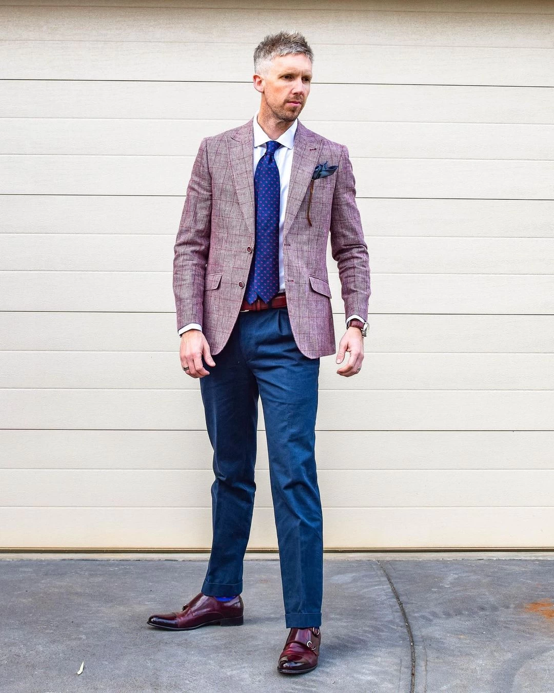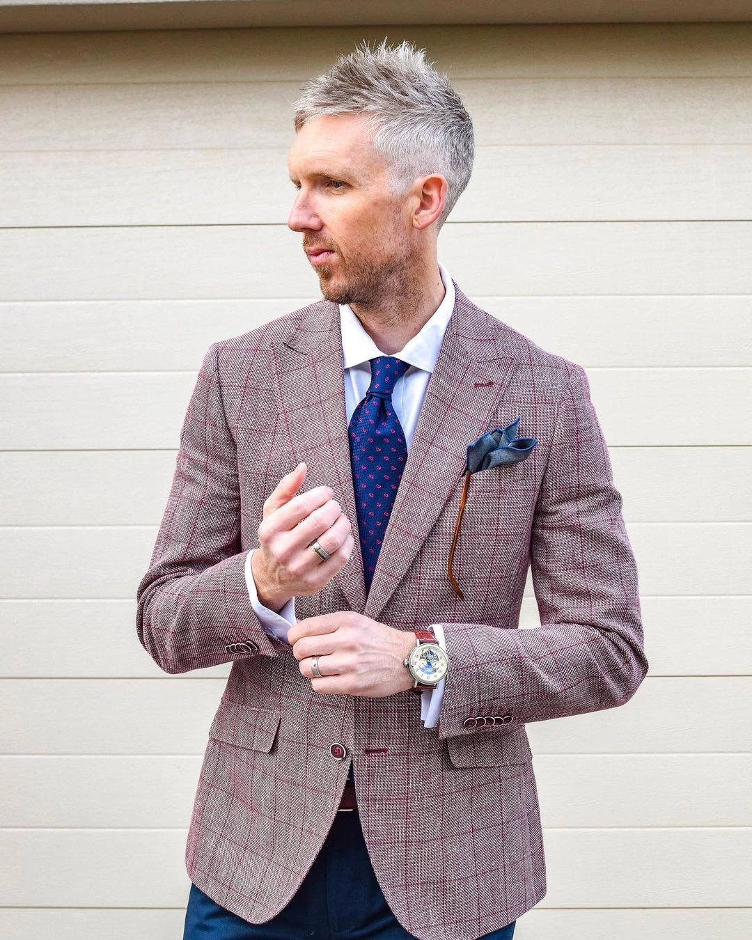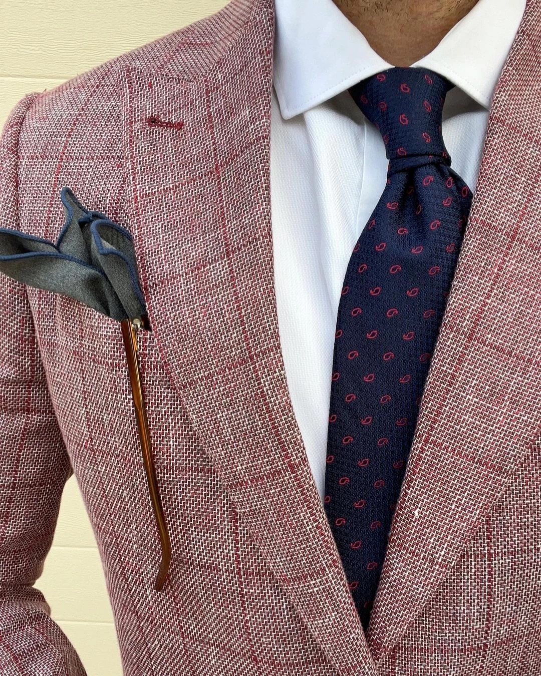 Our experts suggest pairing this stunning silk tie with a solid white, light blue, grey or light pink shirt and a solid, pinstripe or plaid charcoal grey, navy blue or brown suit. A light pink shirt will provide the most contrast, a light blue shirt will offer a monochromatic look, while a white shirt will have you looking extremely elegant.Â
