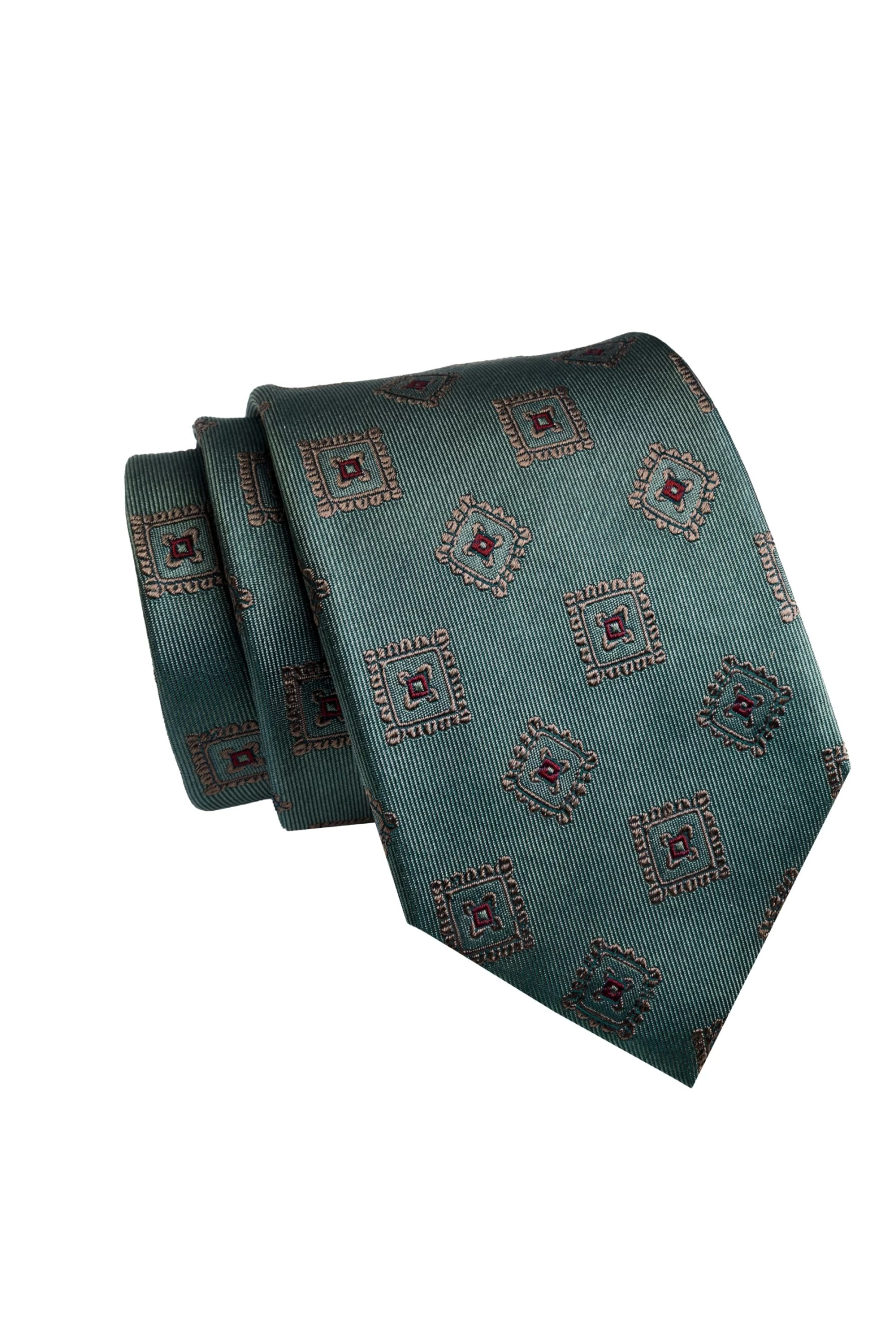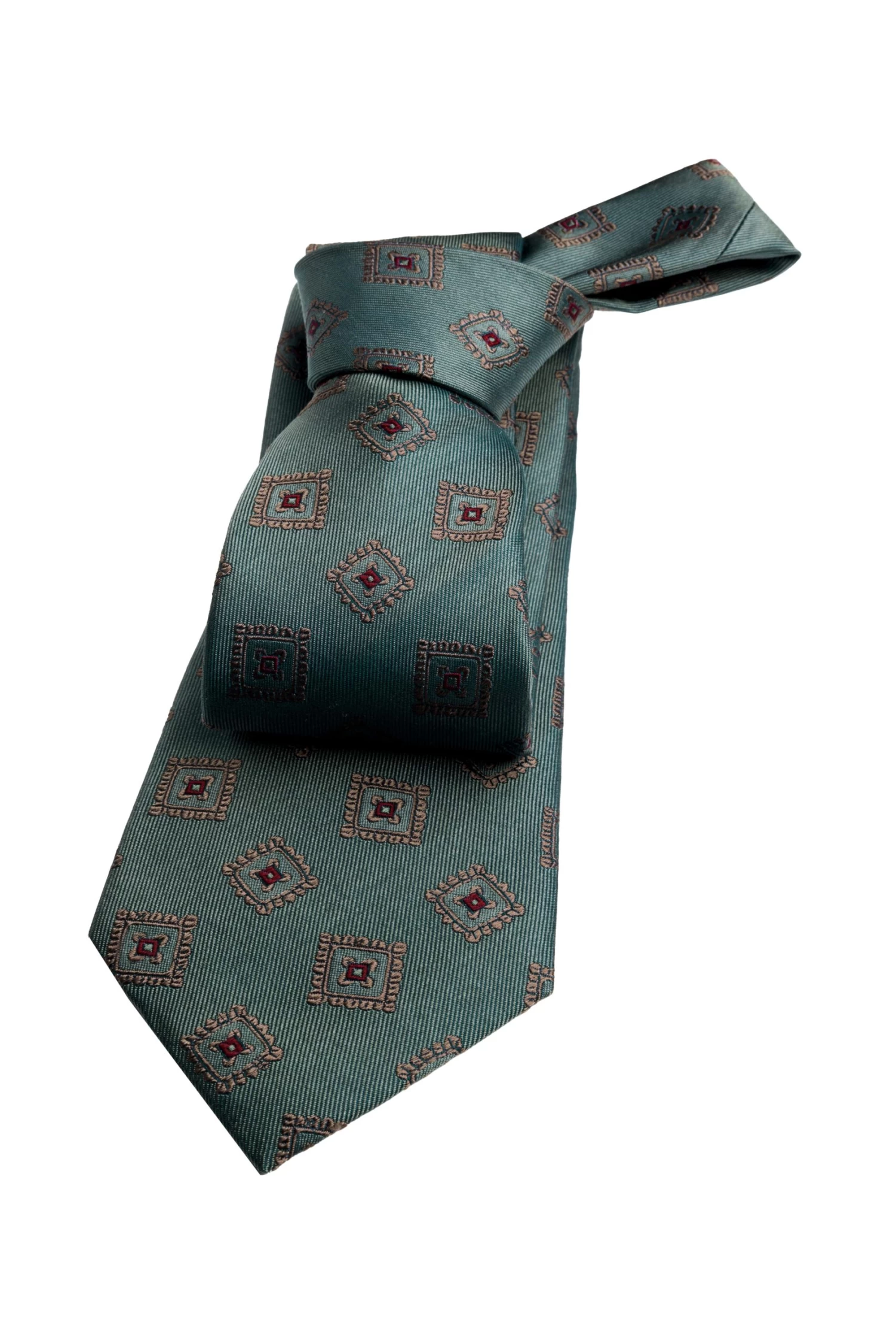 Andover Foulard is part of The Dark Knot’s premium line of ultra high yarn count luxury silk ties, The Haute Collection. This exquisite silk tie features a repeating bronze & red squares pattern set against a rich olive green twill background.Â