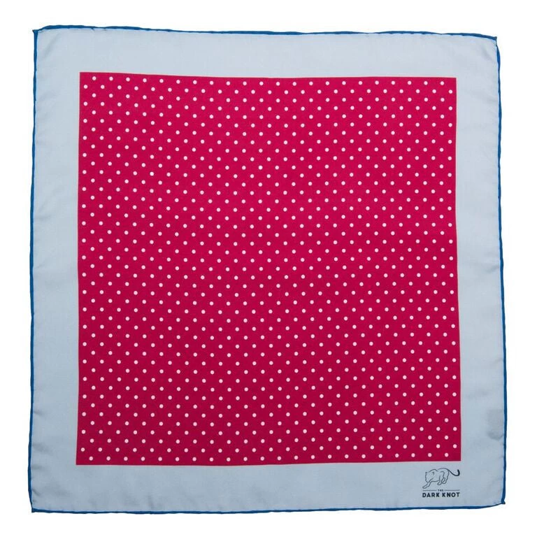 Ashland Dots Burgundy / White is a contemporary hand made polka dot silk pocket square with a white dotted pattern against a burgundy background. This is encompassed by a light blue border with  blue contrasting edges. Wear this pocket square with a puff or edged puff fold for an addition of pop and flair to your ensemble!Â