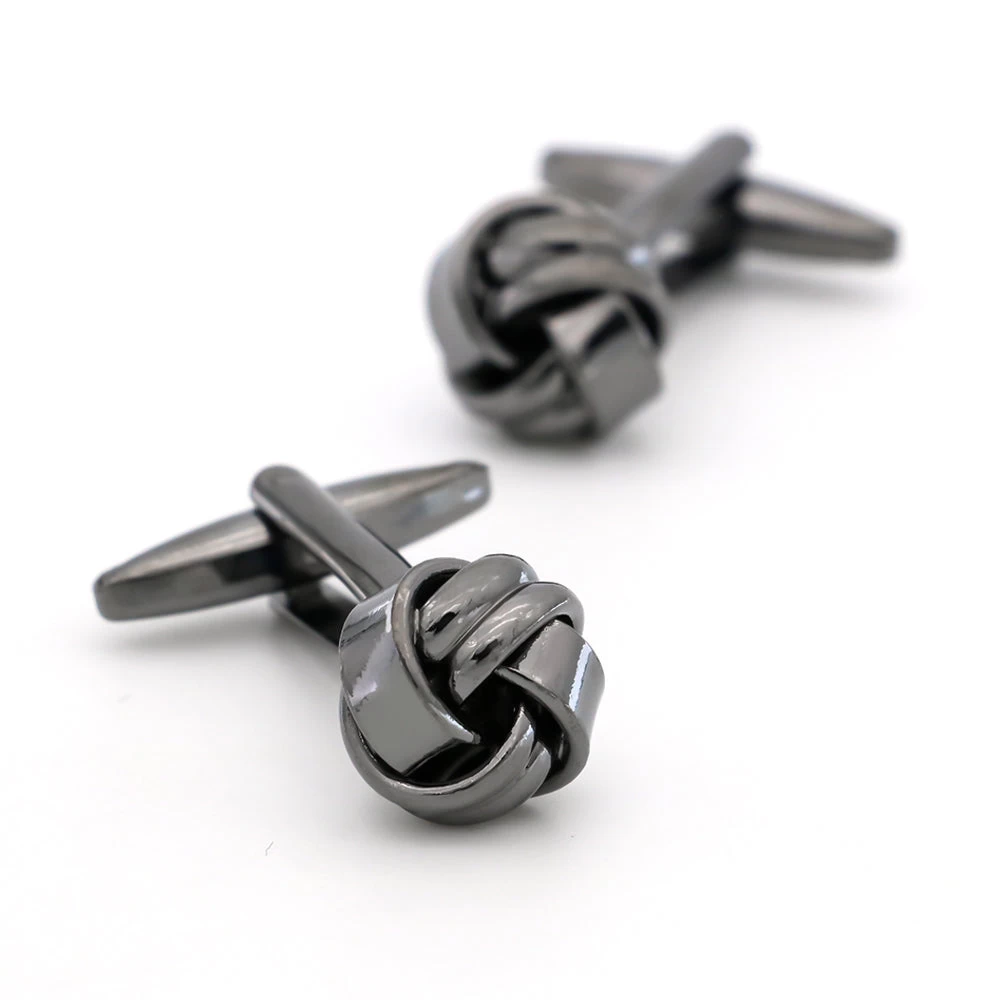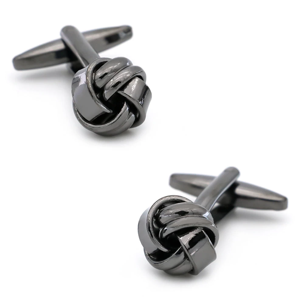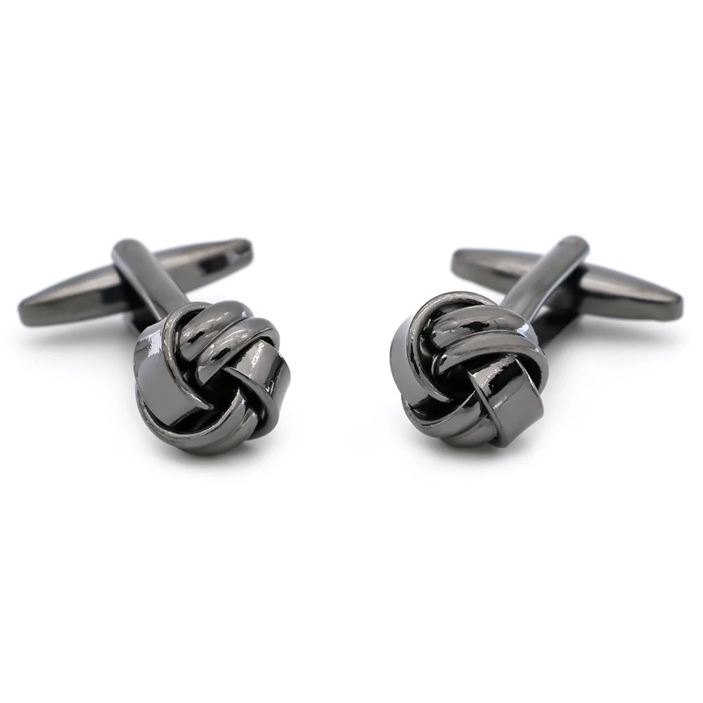 An exquisite set of gunmetal knot cufflinks with a rhodium plated copper base. Features bullet back finishing for interlocking