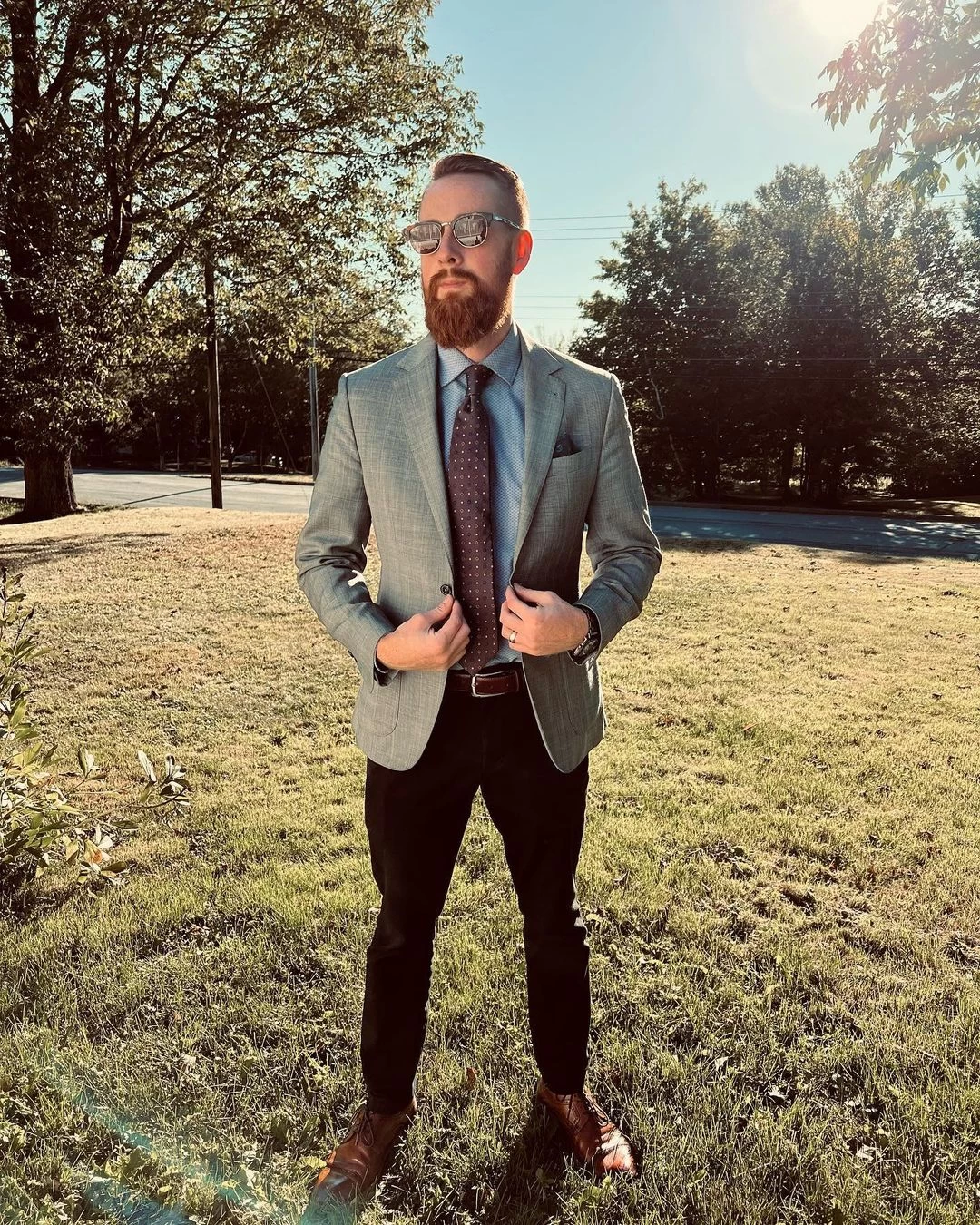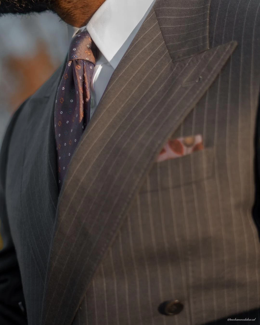 Pair this stunning foulard silk tie with a solid white, light blue or pink shirt and a solid, pinstripe or plaid charcoal grey, navy blue or brown suit. A solid light blue or pink shirt offers the perfect level of contrast with this stunning brown tie, while a white shirt will have you looking elegant.