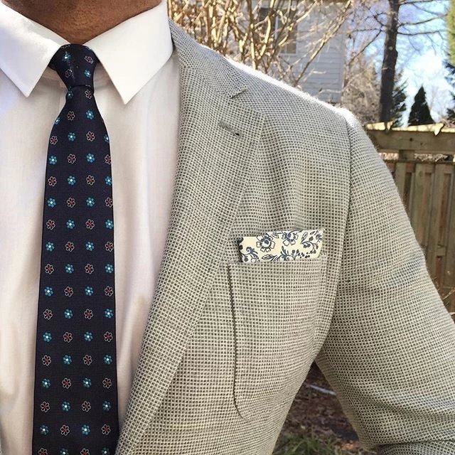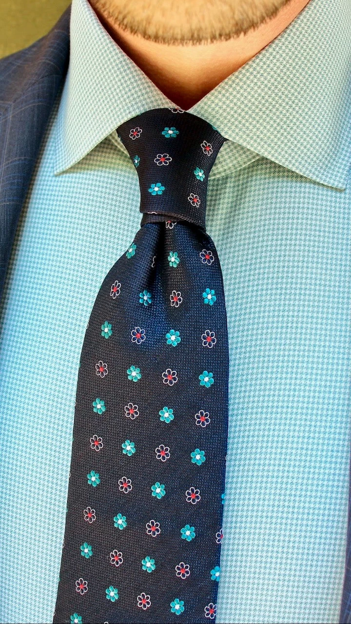 Berkshire Abstract is a contemporary woven silk tie featuring a turquoise floral pattern against a navy houndstooth background.