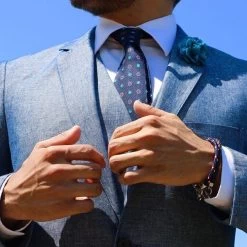 Shirting and suiting options are almost limitless with this premium design. Our experts suggest pairing it with a solid or checkered pink, white, or blue shirt – or a striped pink, white, or blue shirt. As for suiting, this design would pair best with a (solid or pinstriped) navy blue or charcoal grey suit – or you could even wear it with a plaid navy blue, charcoal, or brown suit.