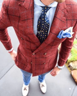 Pair this exquisite silk tie with a solid, striped or microcheckered white, blue, grey or lilac shirt and a solid, striped or plaid charcoal grey, navy blue or brown suit. A blue shirt will provide a great complement, while a lilac shirt will provide the greatest level of contrast.