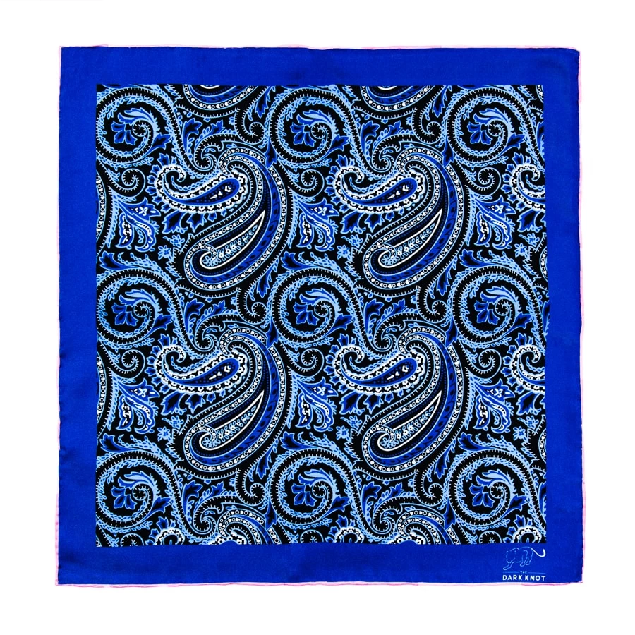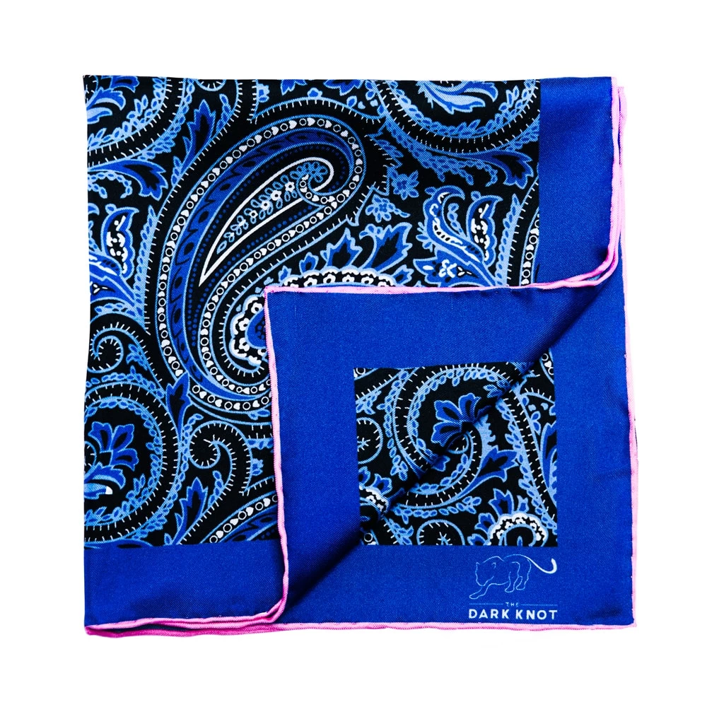 Bloomfield Paisley Blue / White is a contemporary hand made silk pocket square, with a blue and white paisley motif set against a black background. This Pocket Square is finished off with pink hand rolled contrasting edges for further sophistication.