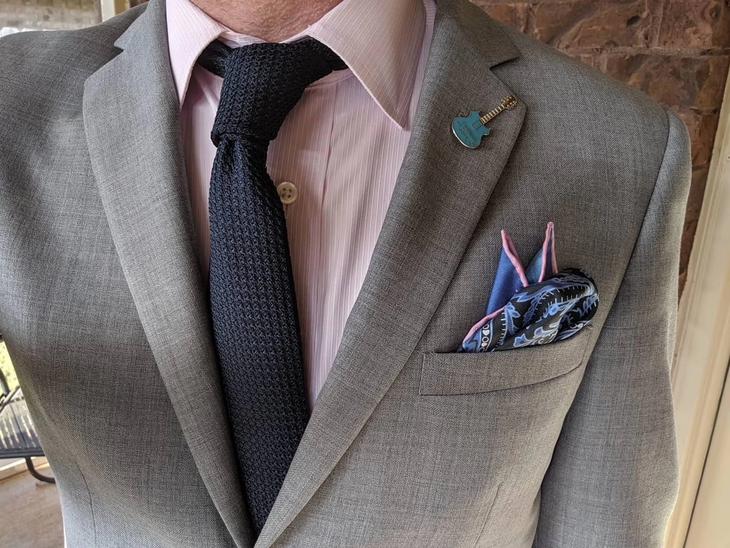 Recommended with a navy, pink, burgundy or purple solid, striped, foulard or polka dot silk tie, all which perfectly complement the rich blue hues on this intricate paisley pocket square. Pink hand rolled contrasting edges provide further sophistication. Alternatively, this can be worn with a jacket and a solid, striped or checkered white, pink or grey shirt.Â