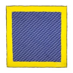 Bridgewater Abstract Blue / White / Yellow is a contemporary hand made abstract silk pocket square, featuring a repeating circular / loop white pattern set against a rich blue background. This pocket square is encompassed by a yellow border, and finished with contrasting blue hand rolled edges. Wear this pocket square with a puff or edged puff fold for an addition of flair and panache to your ensemble.