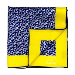 Bridgewater Abstract Blue / White / Yellow is a contemporary hand made abstract silk pocket square, featuring a repeating circular / loop white pattern set against a rich blue background. This pocket square is encompassed by a yellow border, and finished with contrasting blue hand rolled edges. Wear this pocket square with a puff or edged puff fold for an addition of flair and panache to your ensemble.