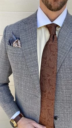 Caledonia Paisley is part of The Dark Knot’s premium line of ultra high yarn count luxury silk ties, The Haute Collection. This exquisite silk tie features an intricate gold paisley pattern set against a rich brown twill background.