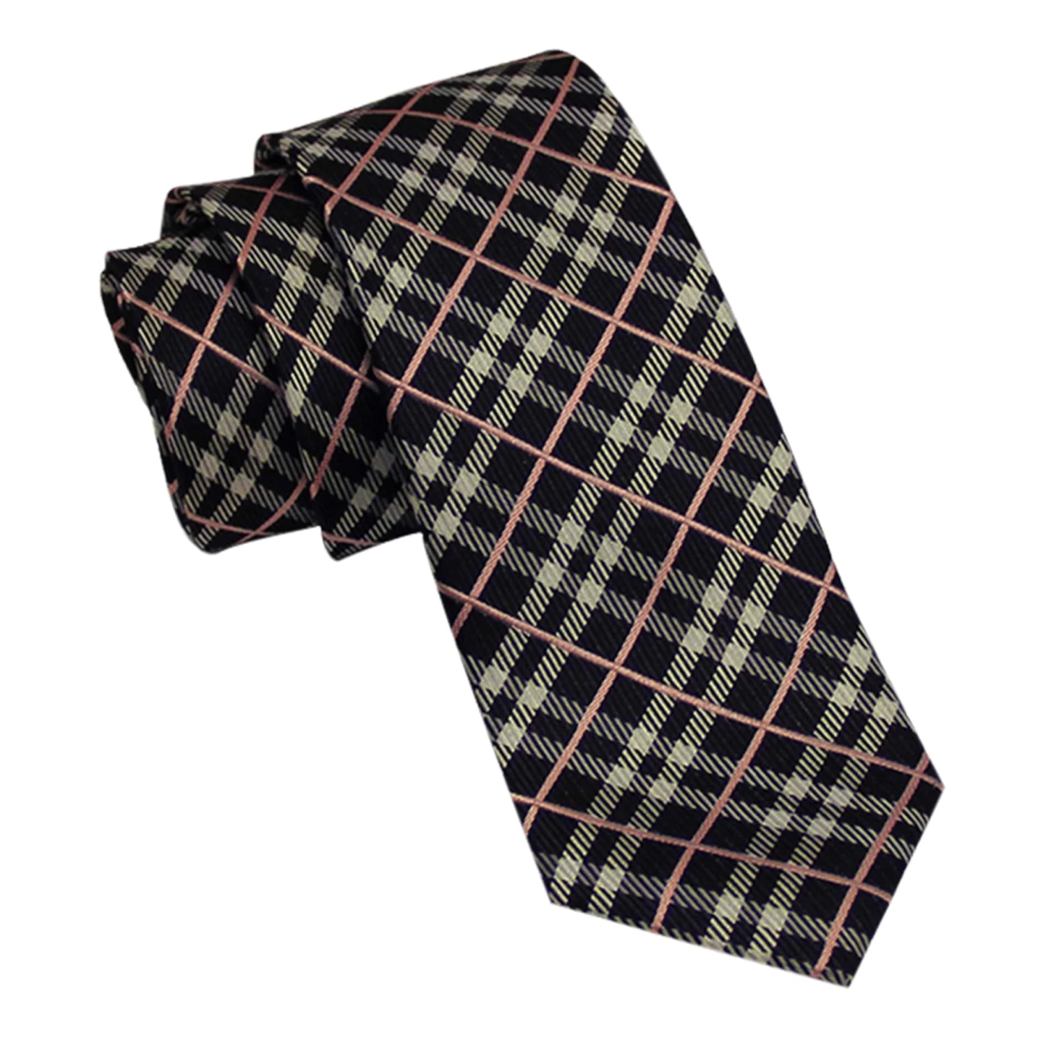 Chester Plaid, of The Skinny Tie Collection, is a contemporary silk tie with a windowpane pink pattern that is set against an intricate silver and black plaid design.Â
