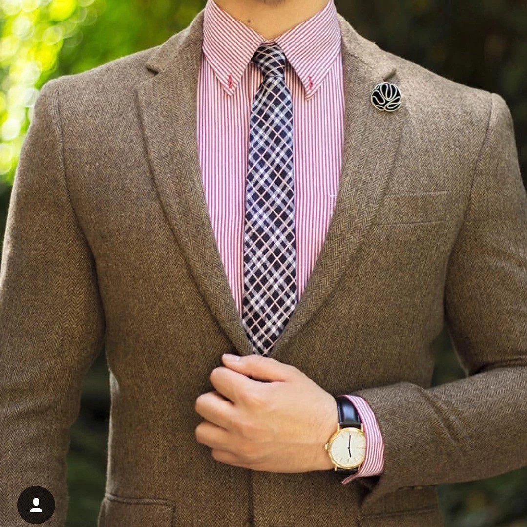 Our experts suggest wearing this modern piece with a solid white, blue, grey or pink shirt and a charcoal grey or navy blue suit.  Pairing with a solid white shirt will have you looking classically elegant, while a blue, pink or grey shirt will reflect a more contemporary and modern look.