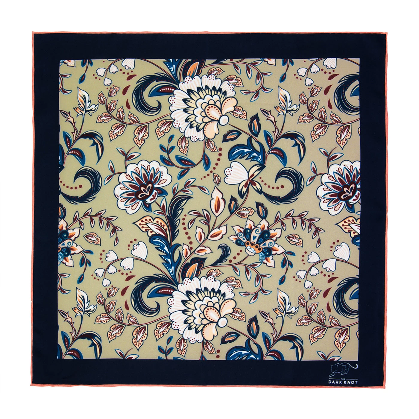 Chesterfield Cream / Blue / White is a contemporary hand made silk pocket square with a stunning blue and white floral pattern set against a cream twill background. This is encompassed by a dark blue border, with pink hand rolled contrasting edges providing further sophistication. Wear this pocket square with a puff or edged puff fold for an addition of flair and panache to your ensemble. Size: 17 inches x 17 inches. Fabric: 100% silk hand made with contrasting hand rolled edges.