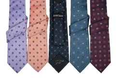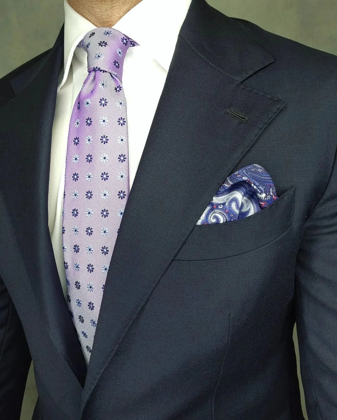 Coventry Foulard is part of The Dark Knot’s premium line of ultra high yarn count luxury silk ties, The Edition Collection. This exquisite silk tie features a repeating navy & light blue floral pattern set against a lilac background.Â
