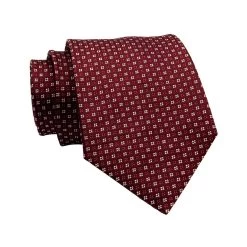 This exquisite silk tie features a repeating silver and burgundy pattern set against a burgundy red background..