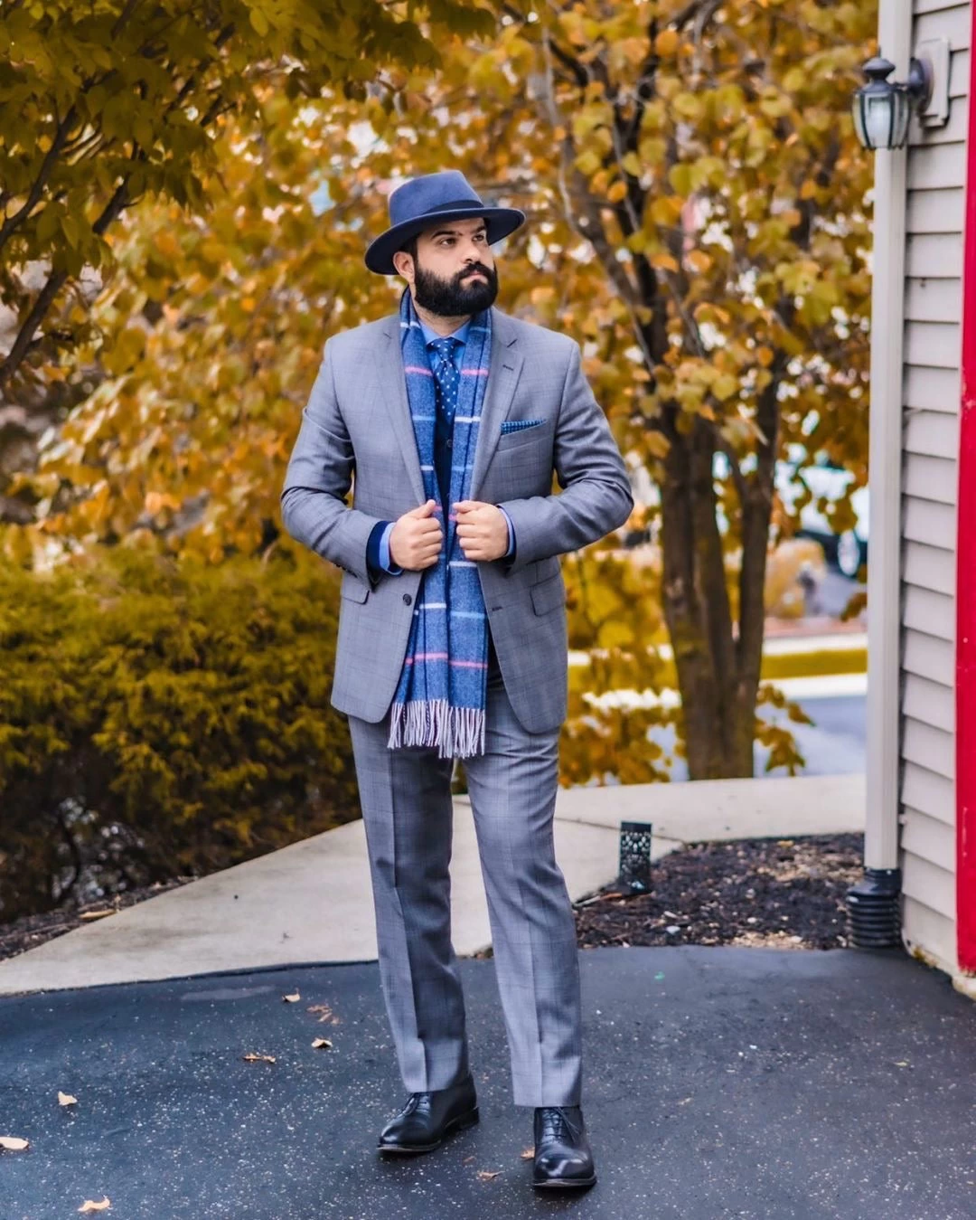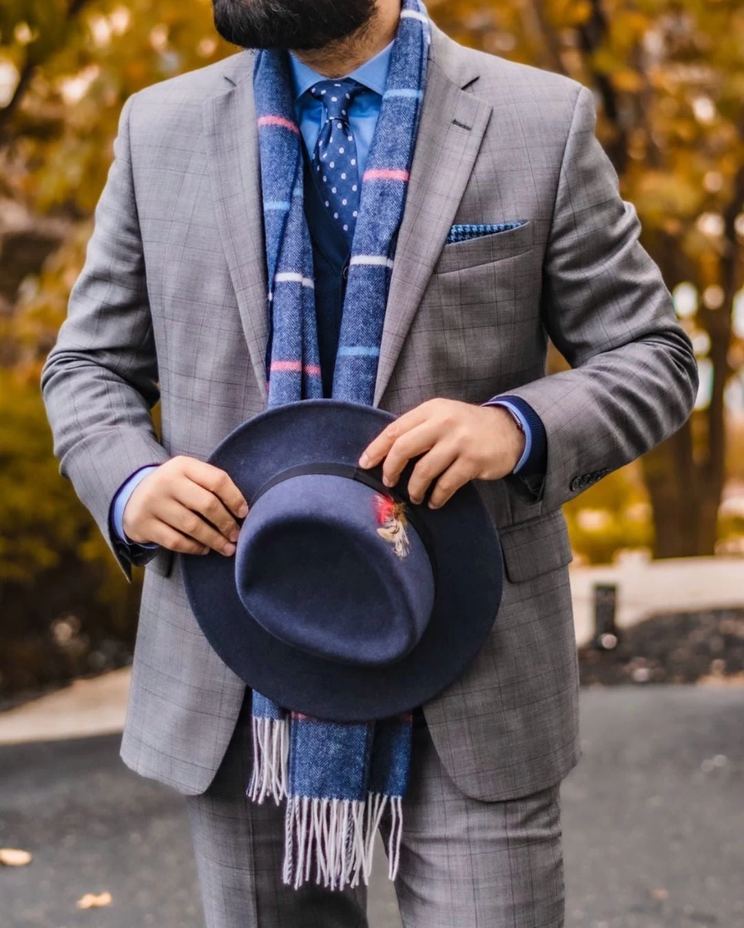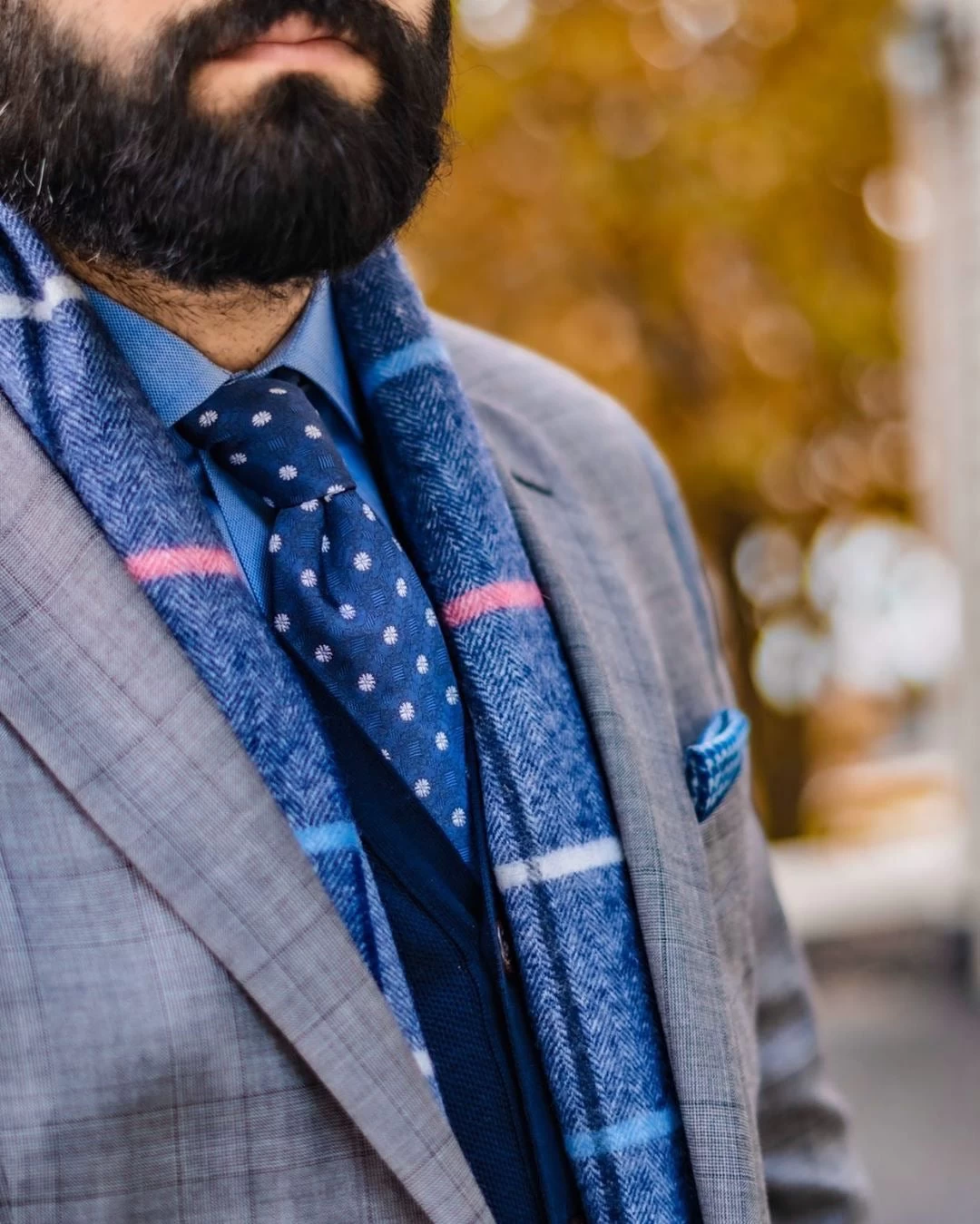Pair this elegant woolen scarf with a solid navy blue or brown suit. Alternatively, this can be worn with a blue or brown sports jacket!
