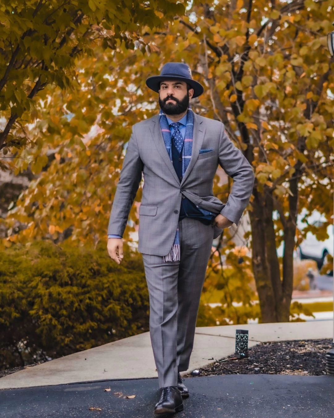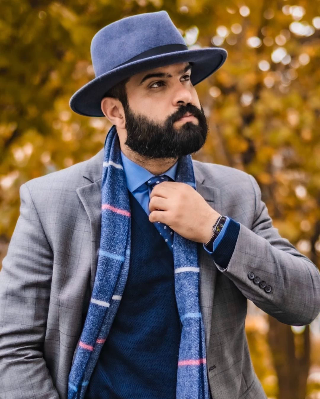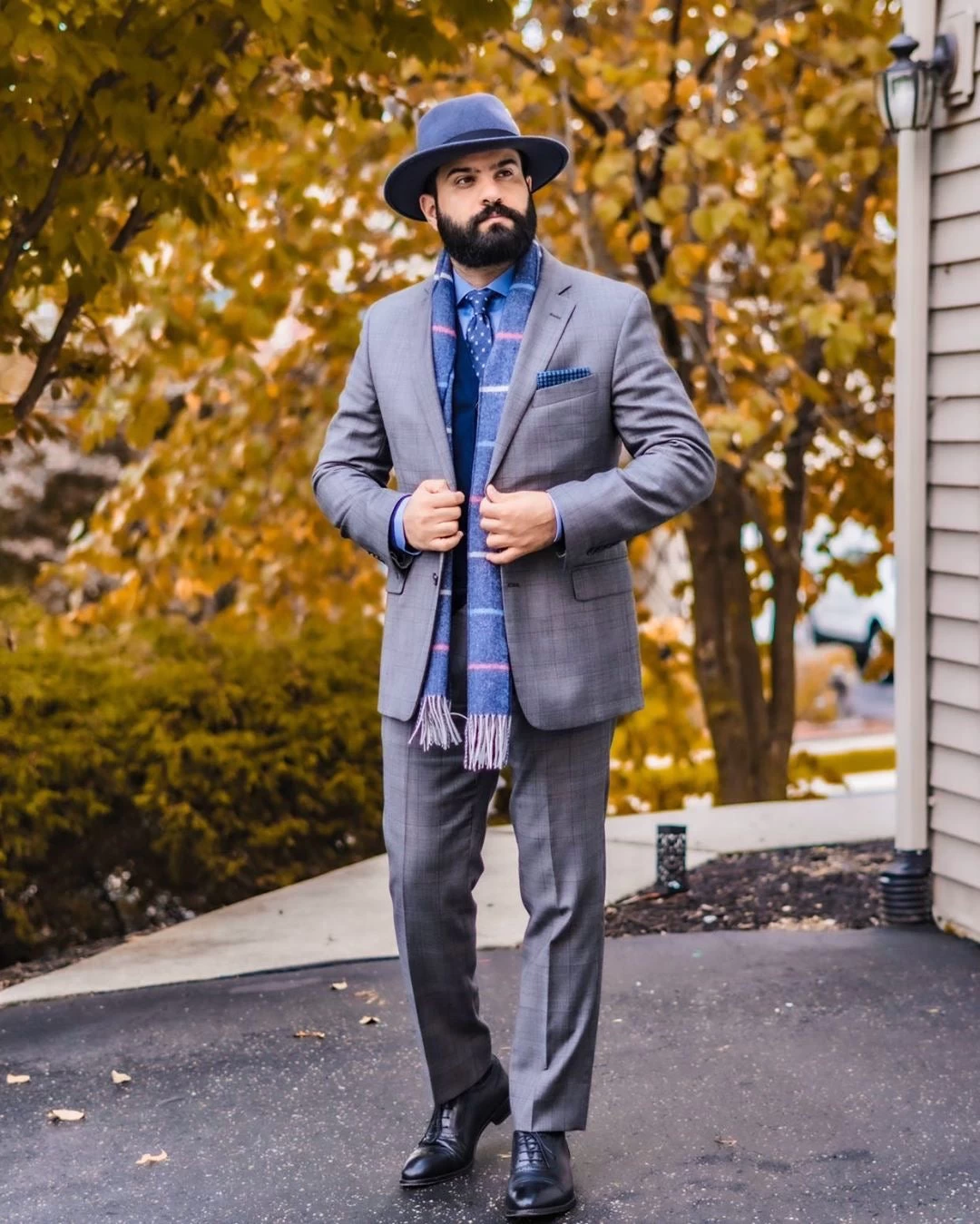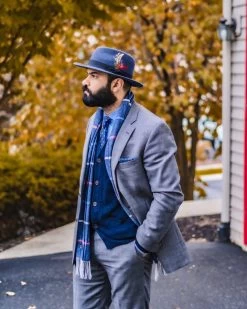 Pair this elegant woolen scarf with a solid navy blue or brown suit. Alternatively, this can be worn with a blue or brown sports jacket!