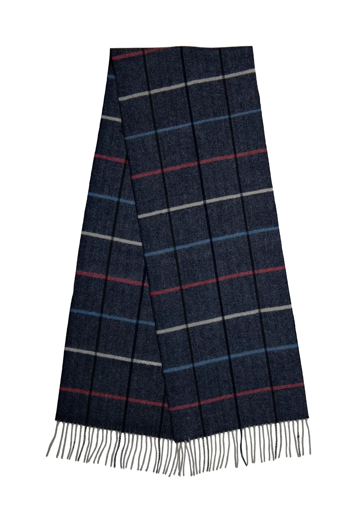 Elmira Plaid Grey is a contemporary grey woolen checkered scarf with white tassels. Features light blue, white, black and red lines set against a grey herringbone background.