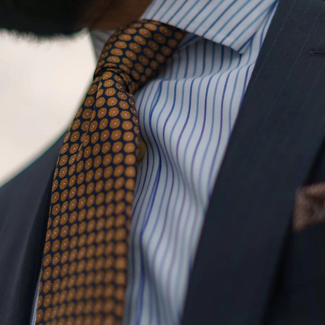 Fall River Foulard is part of The Dark Knot’s premium line of ultra high yarn count luxury silk ties, The Edition Collection. This exquisite silk tie features a repeating orange and gold medallion pattern set against a rich navy background.
