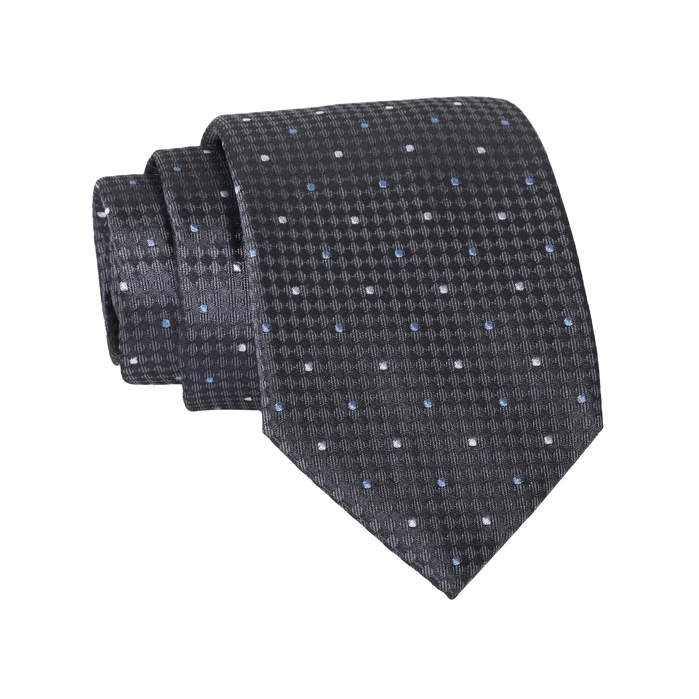 French Creek is an exquisite polka dot silk tie, featuring a repeating silver & light blue dotted pattern set against an intricate, rich grey background.