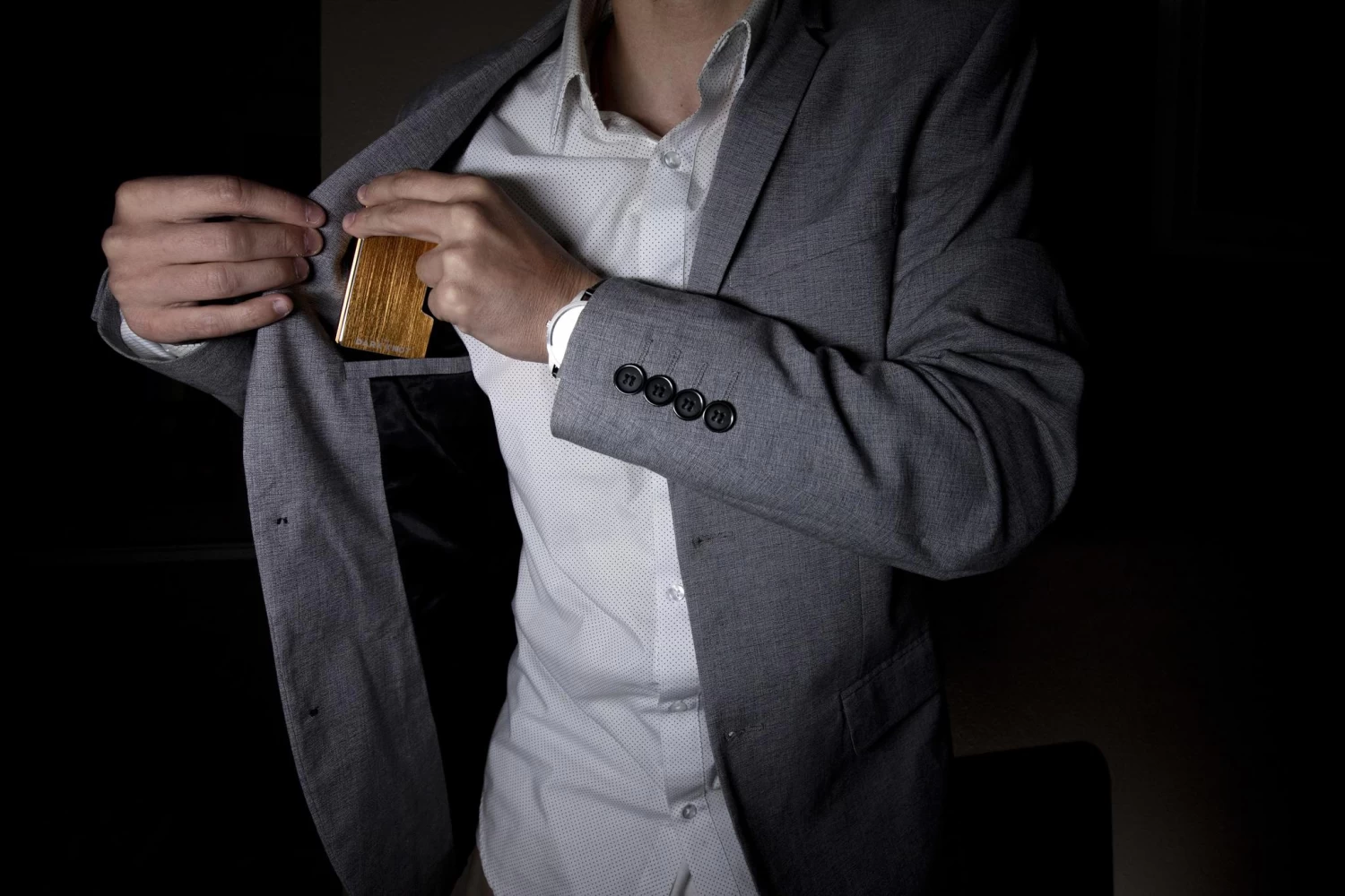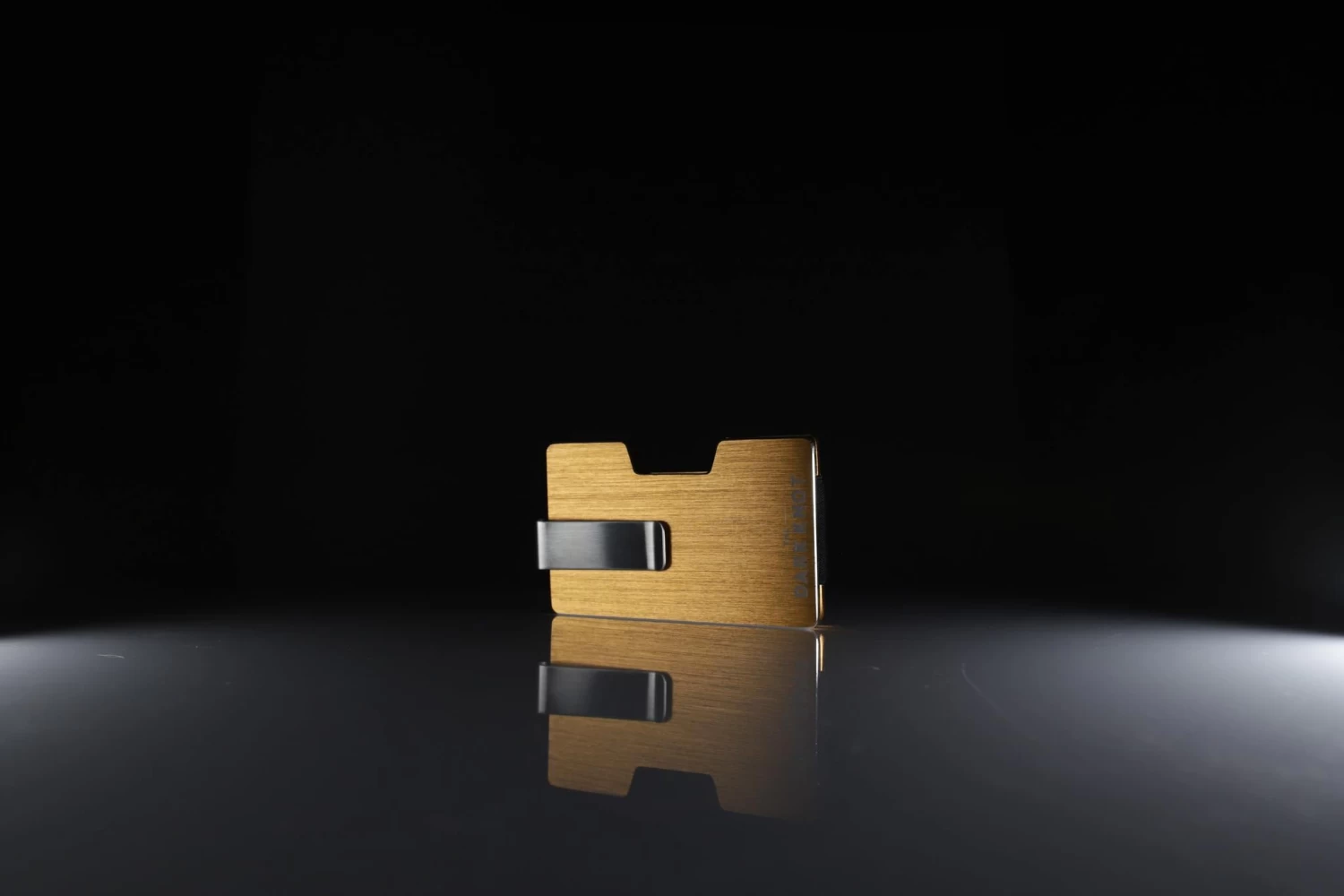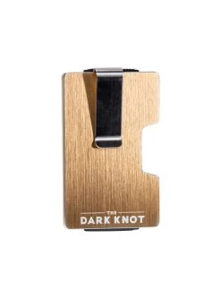 Gold, aluminum wallet with a detachable money clip.