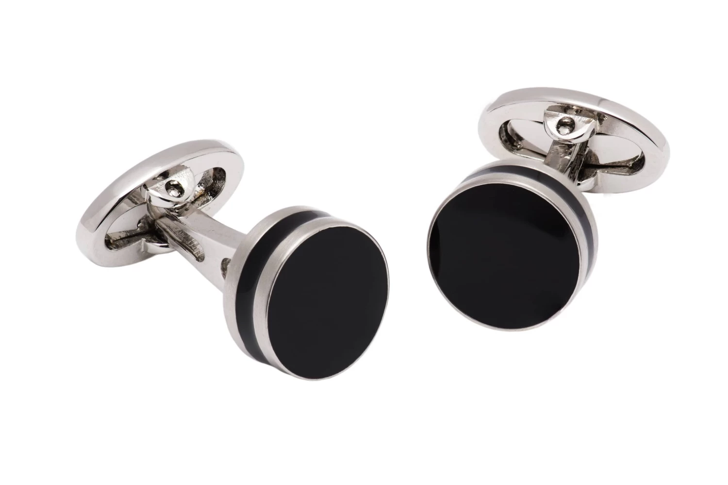 Whaleback, rhodium-plated brass cufflinks with a black stud enamel facing.