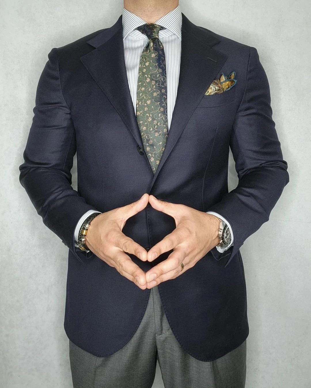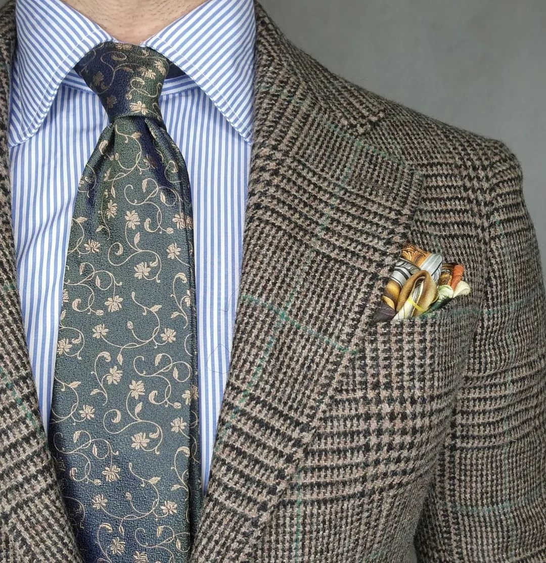 Pair this exquisite floral silk tie with a solid, finely striped or microcheckered white, light blue or light pink shirt and a solid, pinstripe or plaid charcoal grey, navy blue or brown suit. A light pink shirt will provide the perfect level of contrast, a light blue shirt will offer a harmonized, familiar look while a white shirt will have you looking classically elegant.