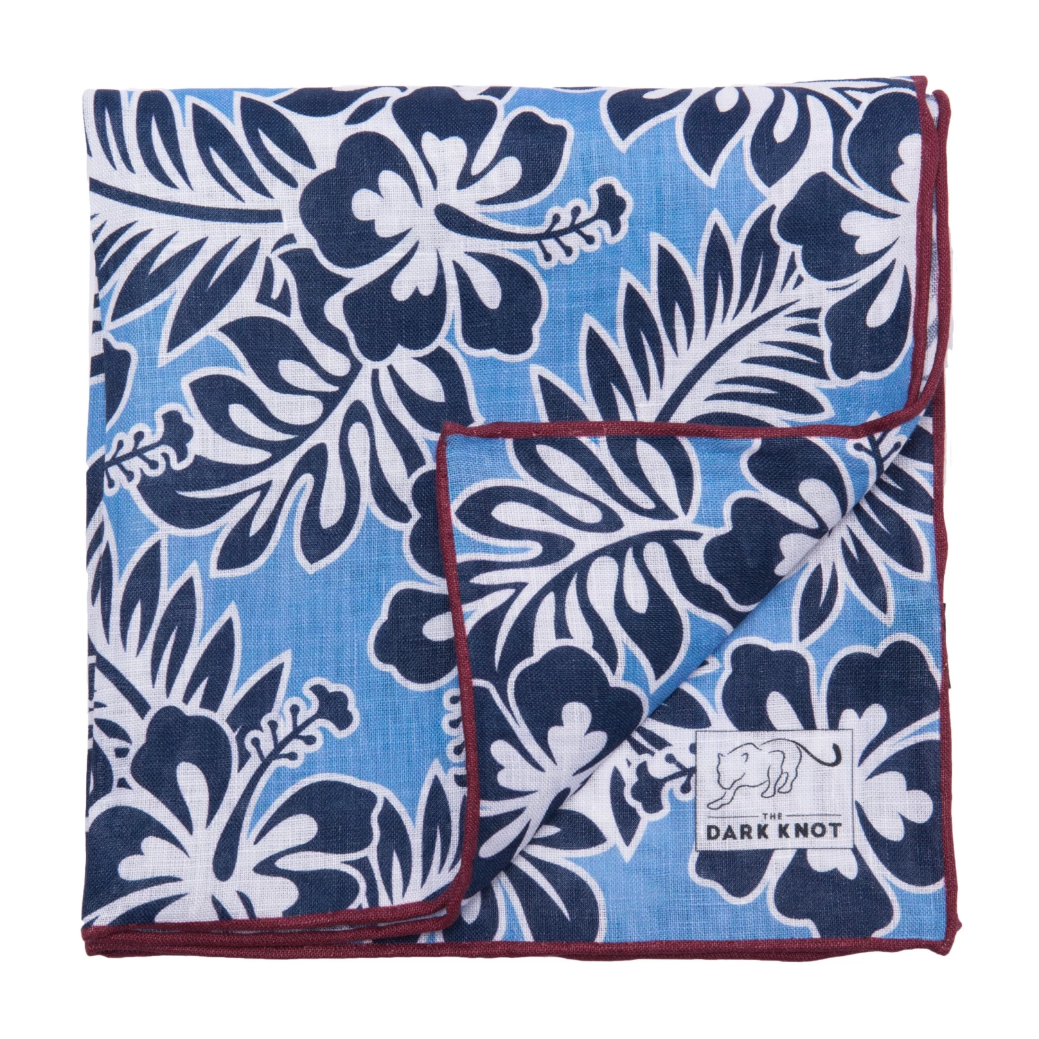 Lake George Blue / White / navy is a contemporary hand made linen pocket square with a white and navy nature pattern set against a blue background. This pocket square is finished with hand rolled burgundy contrasting edges.Â