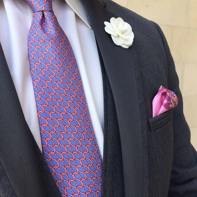 Recommended with a blue, red or pink silk tie and a linen or silk pocket square in one of the remaining colors for maximum effect.