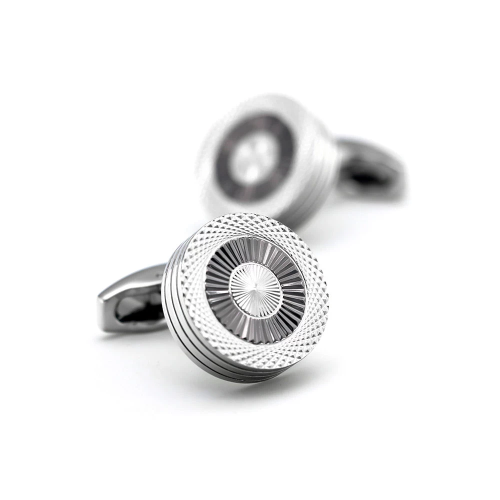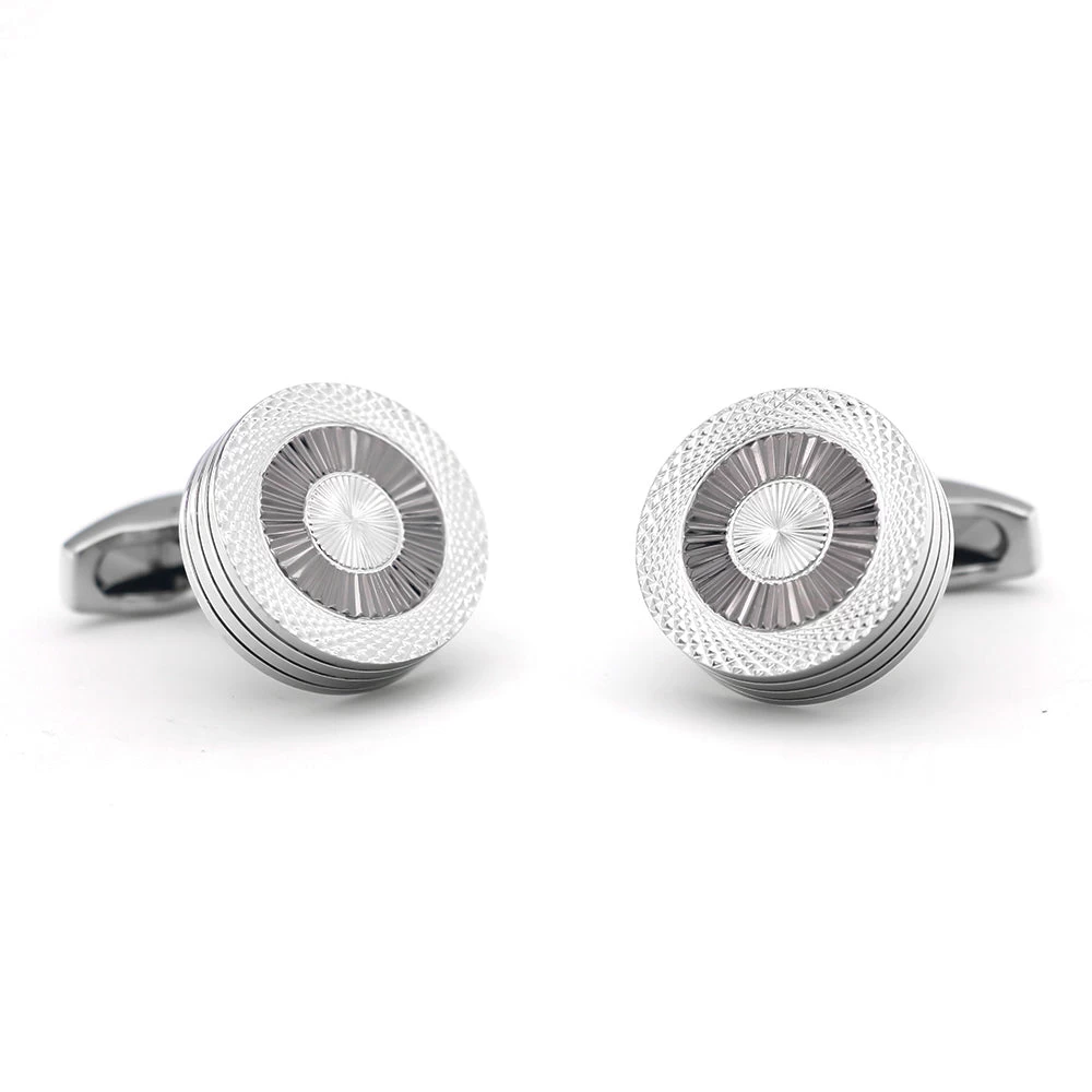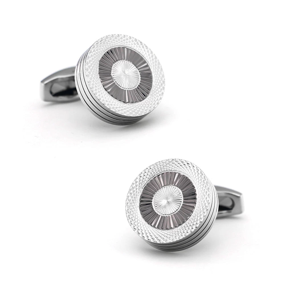 An exquisite pair of cufflinks entailing intricate silver & gunmetal circles set against a rhodium plated copper base. Featuring whaleback finishing for interlocking.