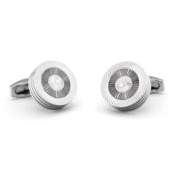 Whaleback, rhodium plated copper cufflinks with an intricate silver & gunmetal circles design.