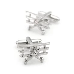 A stunning set of silver airplane cufflinks set against a rhodium plated copper base. Features bulletback finishing for interlocking.