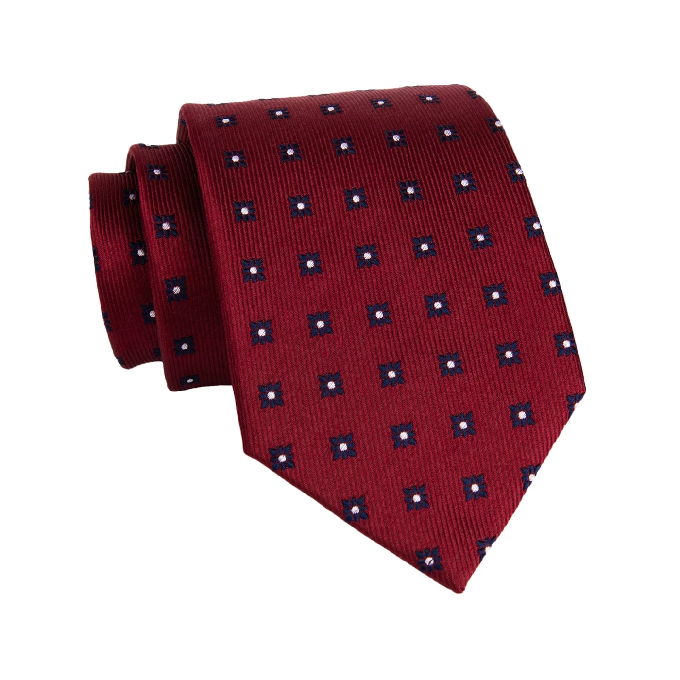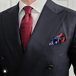 Oakland Foulard is a stunning foulard silk tie featuring a repeating navy and silver squares pattern set against a rich red twill background.