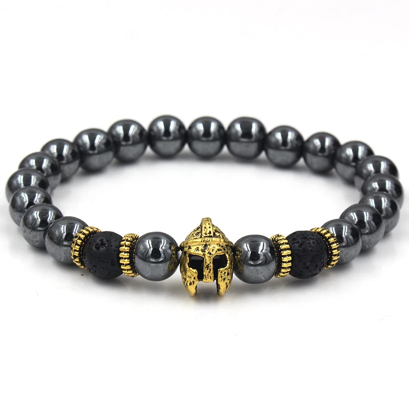 A stunning black hermatite and lavastone beaded bracelet featuring gold zinc segments and an opaque gold zinc helmet.