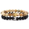 Black hermatite and lavastone beaded bracelet featuring silver zinc segments and an opaque silver zinc helmet. Elastic rope finishing makes this bracelet wearable across all wrist sizes. Length: 19.5 cm