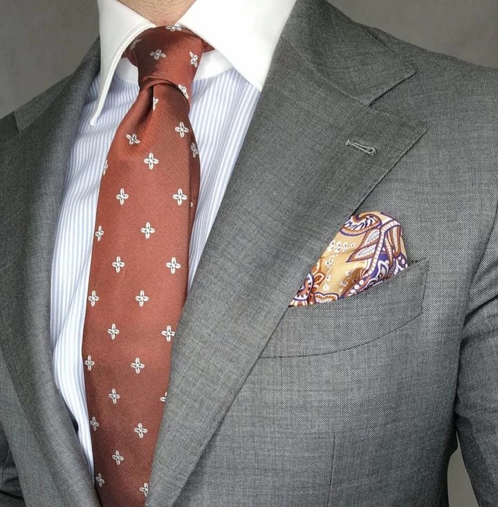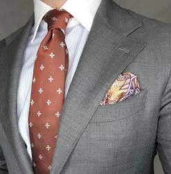 Pair this stunning foulard silk tie with a solid, finely striped or microcheckered white, light blue, light green or grey shirt and a solid, pinstripe or plaid charcoal grey or navy blue suit. A light blue or green shirt will provide for the perfect level of contrast, a grey shirt will offer an ideal neutral backdrop, while a white shirt will have you looking classically elegant.
