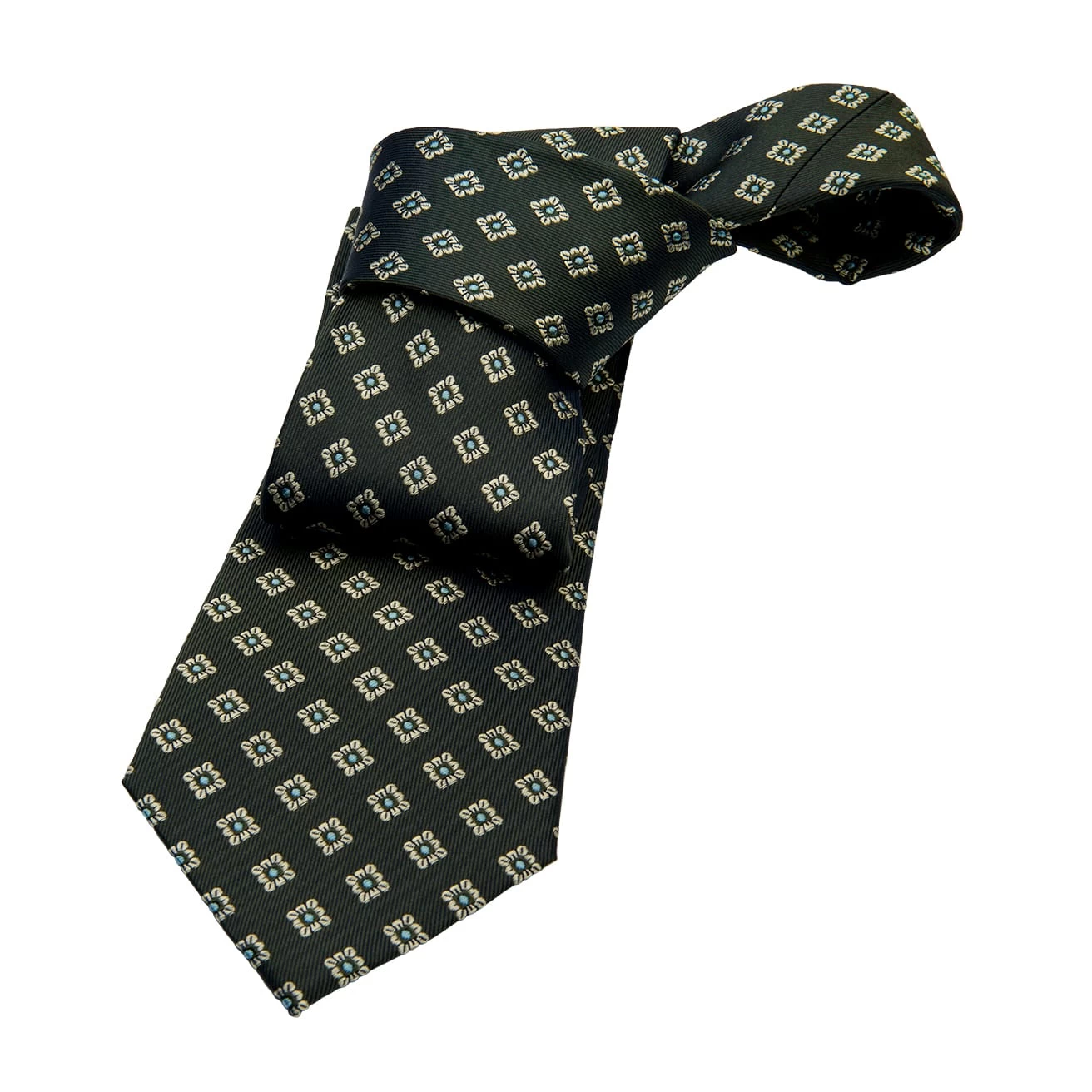 This stunning silk tie features a repeating silver and turquoise pattern set against an olive green background.Â