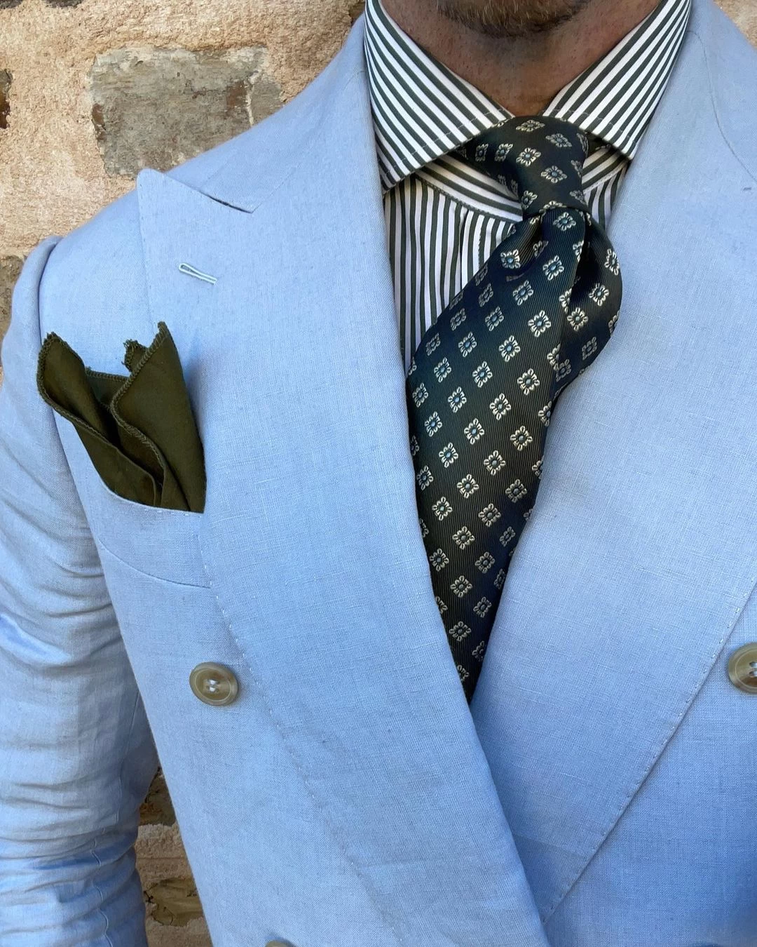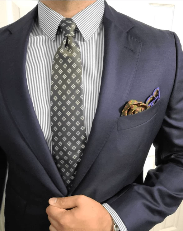 Pair this exquisite silk tie with a solid white, blue or light pink shirt and solid, pinstripe or plaid charcoal grey, navy blue or brown suit. A blue shirt will provide a look of familiarity, while a pink shirt will provide the greatest level of contrast.