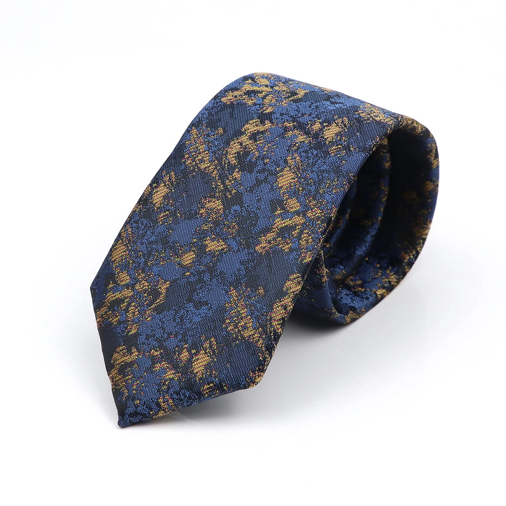 Pembroke Pines Abstract is a stunning skinny polyester jacquard tie, featuring a gold abstract pattern set against a blue background.
