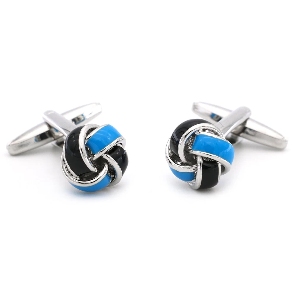 A stunning set of blue & black knot enamel cufflinks set against a rhodium plated copper base. Features bullet back finishing for interlocking