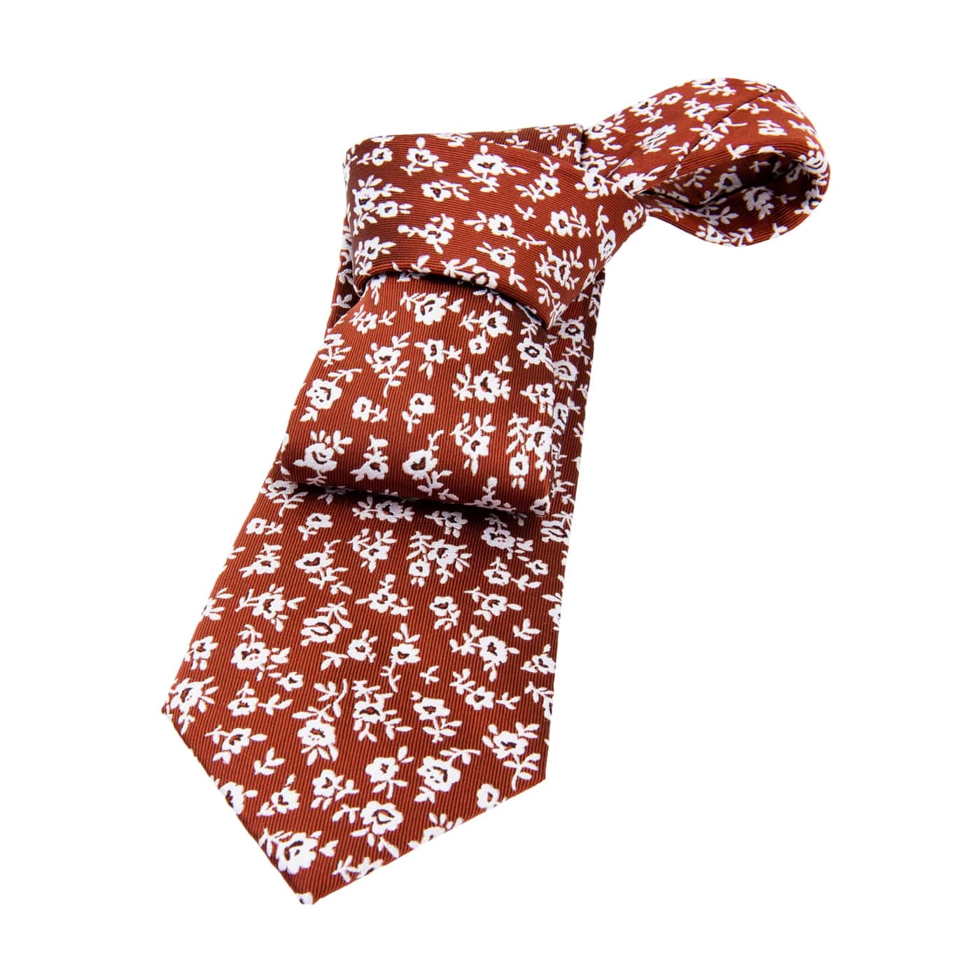 Roxbury Floral is part of The Dark Knot’s premium line of ultra high yarn count luxury silk ties, The Edition Collection. This exquisite silk tie features a repeating silver floral pattern set against a rust orange twill background.