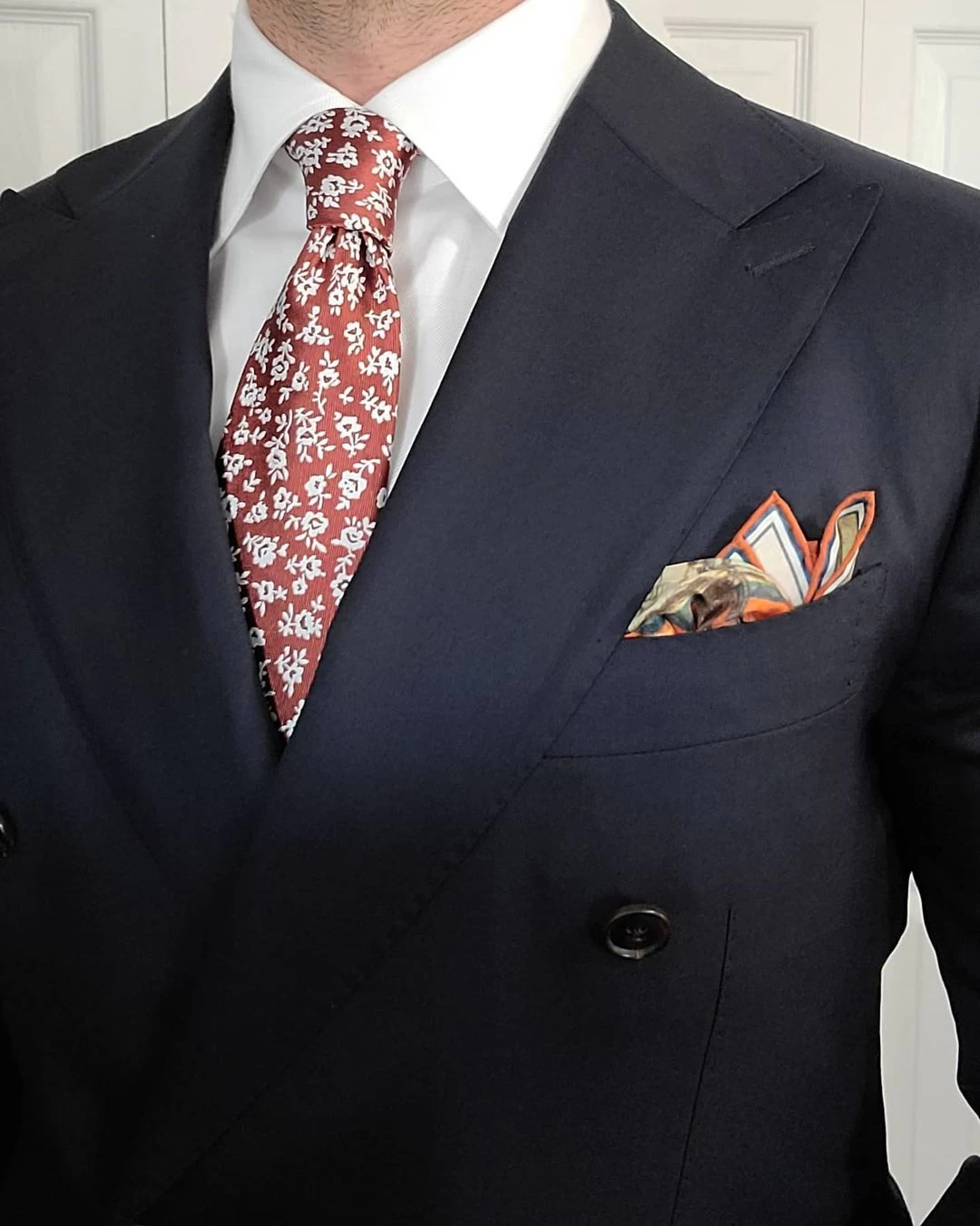 Pair this stunning floral silk tie with a solid, striped or microcheckered white, blue or grey shirt and a solid, pinstripe or plaid charcoal grey or navy blue suit. A blue shirt will provide a strong level of contrast and subsequent pop, a grey shirt will offer a neutral backdrop while a white shirt will leave you looking elegant.Â