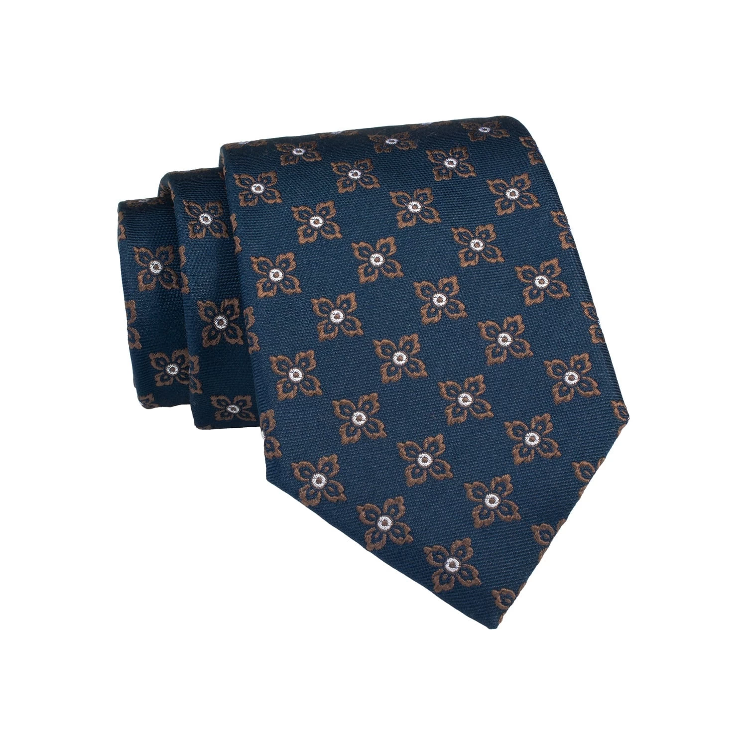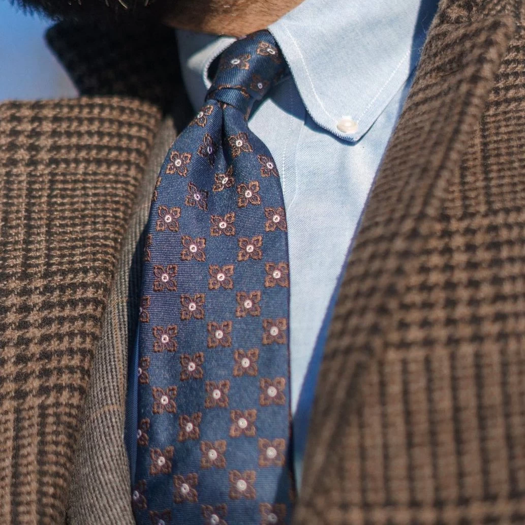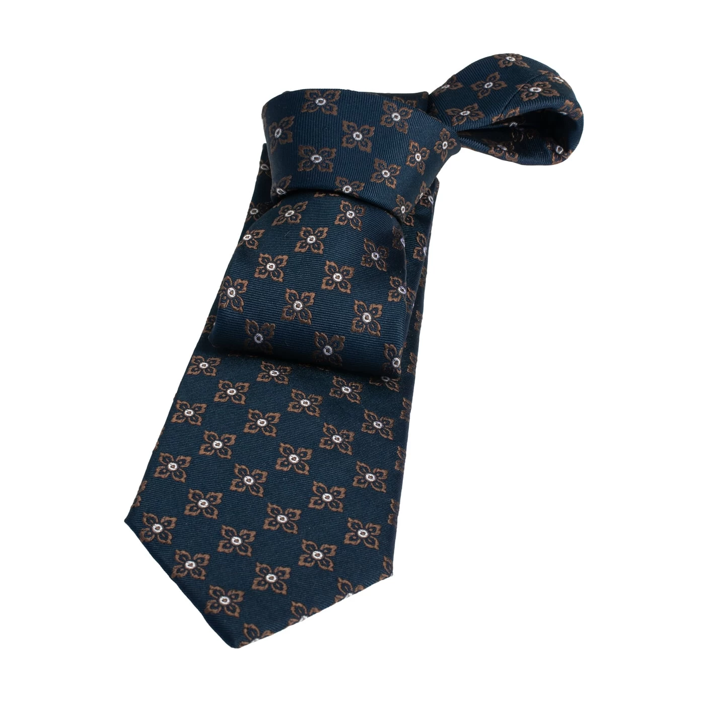 Seabrook Foulard is an exquisite silk tie, featuring a repeating light brown and silver pattern set against a navy twill background.