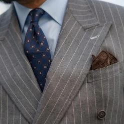 Pair this stunning foulard silk tie with a solid, striped or microcheckered white, light blue, green, pink, lilac or grey shirt and a solid, pinstripe or plaid charcoal grey, navy blue or brown suit. A light blue shirt will provide a monochromatic look, a pink shirt will offer the perfect level of contrast, a green or lilac shirt will provide a sense of familiarity, while a white shirt will have you looking elegant. The pattern spacing of this design allows it to be worn with a range of underlying shirt and suit patterns.Â