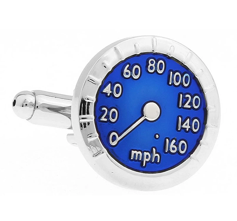 Bulletback, rhodium plated copper cufflinks with a blue enamel speedometer design.