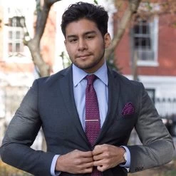 Our experts suggest wearing this contemporary styled tie with a solid blue, pink, or white shirt and a solid or pinstriped charcoal grey or navy blue suit.  Pairing this with a blue shirt will provide great contrast and visual interest, the pink will give you a modern, monochromatic look, while the classic white will have you looking more elegant and professional.Â