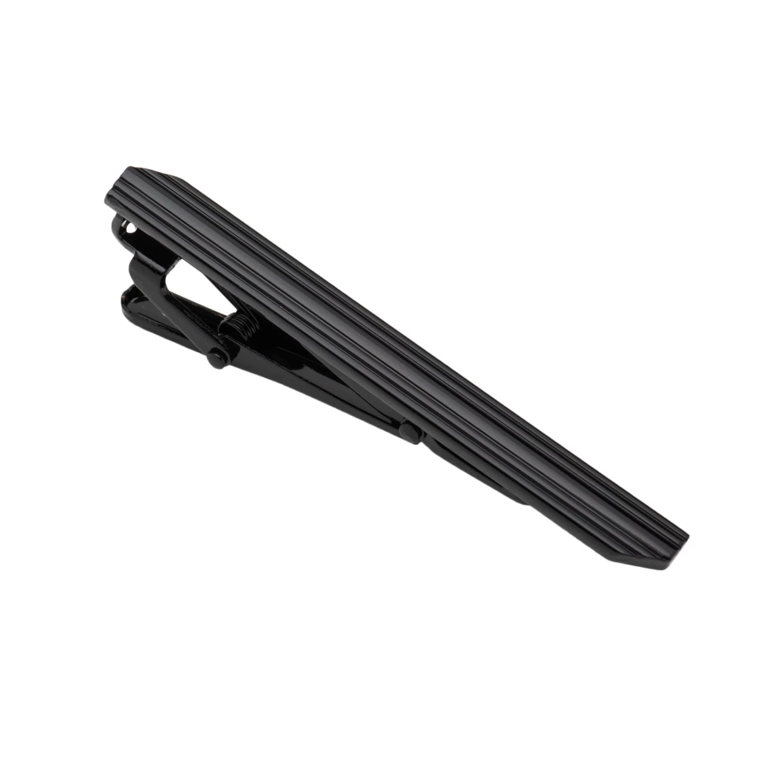 An exquisite, black, stainless steel, ridged surface 2 1/4 inch (5.8 cm) tie bar with pinch clasp finishing that will hold your tie securely in place.