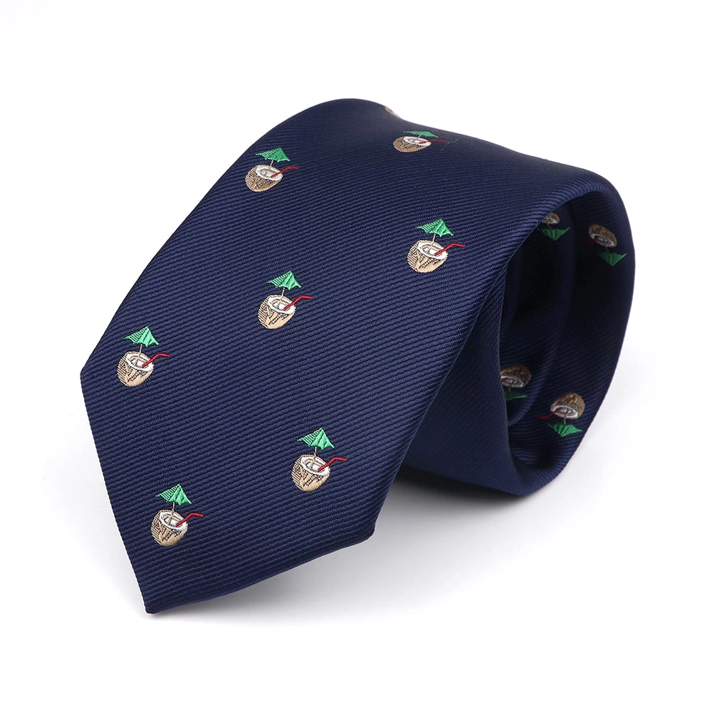 Tampa Coconuts is a novelty polyester jacquard tie, featuring a repeating coconut drink motif set against a rich navy twill background.