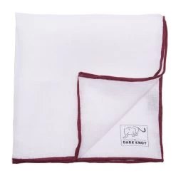 Tuxedo White is a contemporary hand made white linen pocket square with burgundy contrasting hand rolled edges. Wear this Pocket Square with a Presidential Fold for extra sophistication and panache!