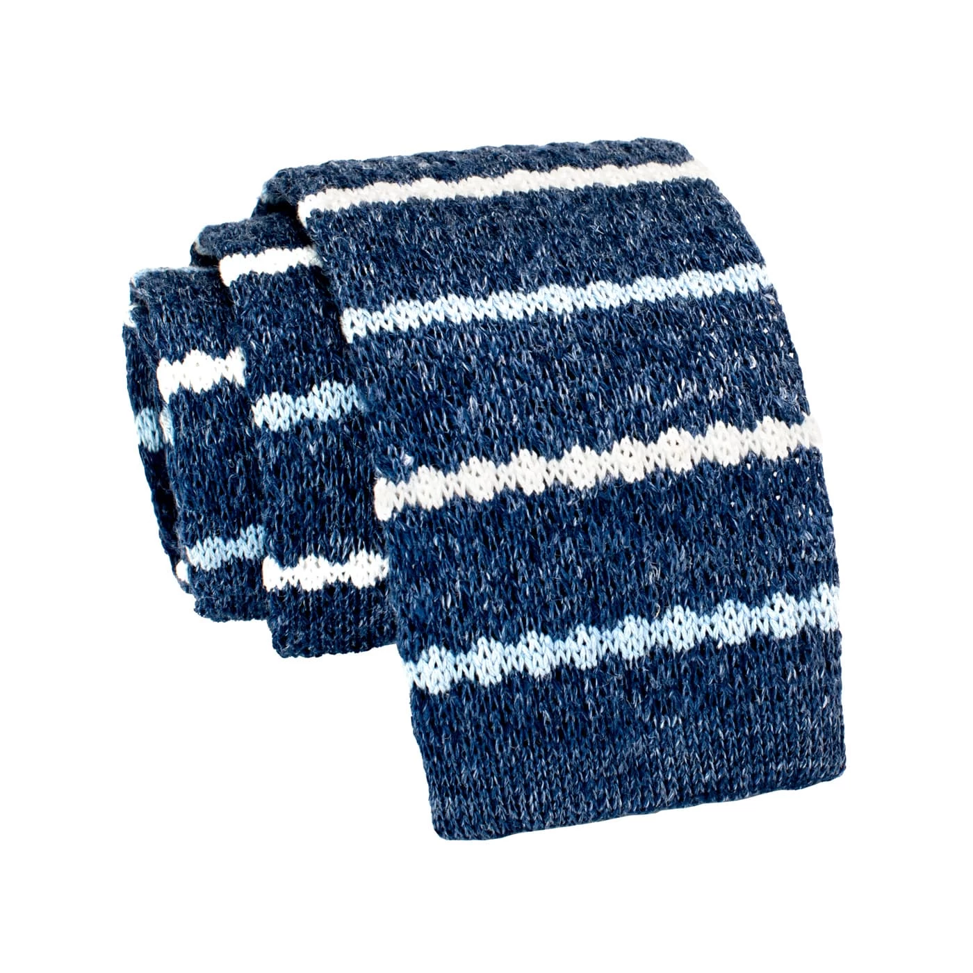 An exquisite hand made knitted linen tie with a soft finish for a casual yet elegant look. This pattern consists of light blue and white stripes set against a grey background.Â