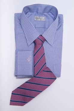 Wilton Stripes is a contemporary woven silk tie that features light and dark blue British stripes running across a background of checkered, red houndstooth. Â
